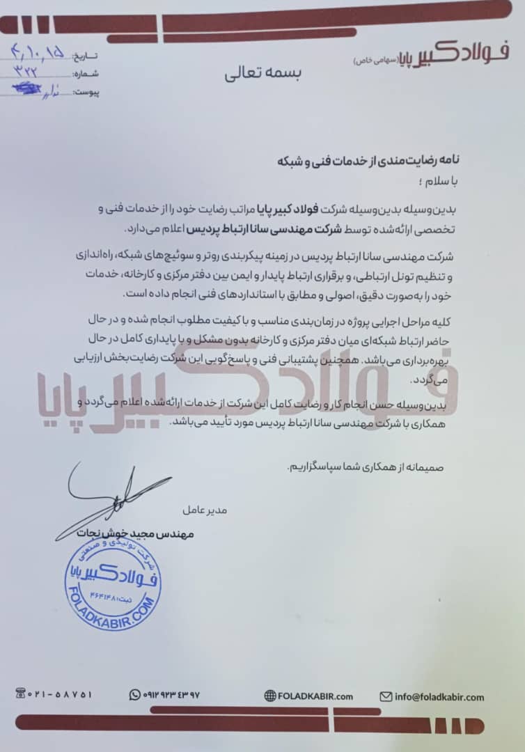 سانا ارتباط پردیس به عنوان یکی از شرکتهای پیشرو در زمینه ارائه خدمات مرتبط با مخابرات و شبکه، و با اتکا به بیش از 15 سال سابقه، خدمات متنوعی از قبیل نصب و راهاندازی زیر ساخت شبکه و مرکز تلفن سانترال و VOIP، تا پشتیبانی و نگهداری و مشاوره و … را به سازمانها و شرکتهای مختلف ارائه نموده است.