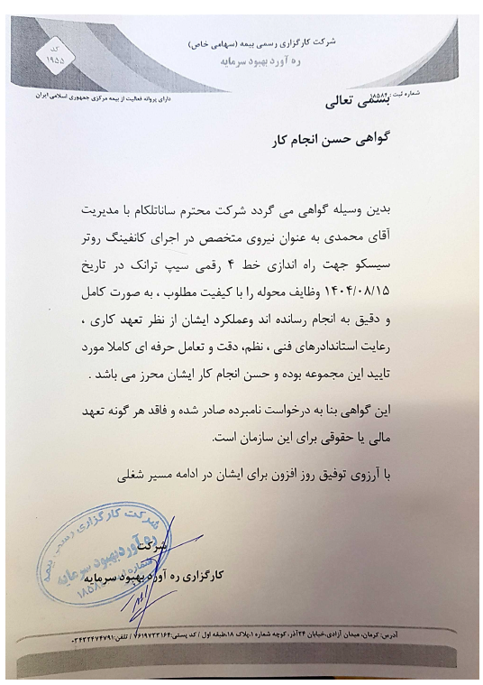 این شرکت مفتخر است که در طی این سالها، با بهرهگیری از تواناییهای کادری مجرب توانسته رضایت مشتریان خود را جلب نموده و با خدمات و پشتیبانیهای مستمر خود در صرفهجویی هزینهها و افزایش بهرهوری پرسنل شرکتها سهیم باشد.